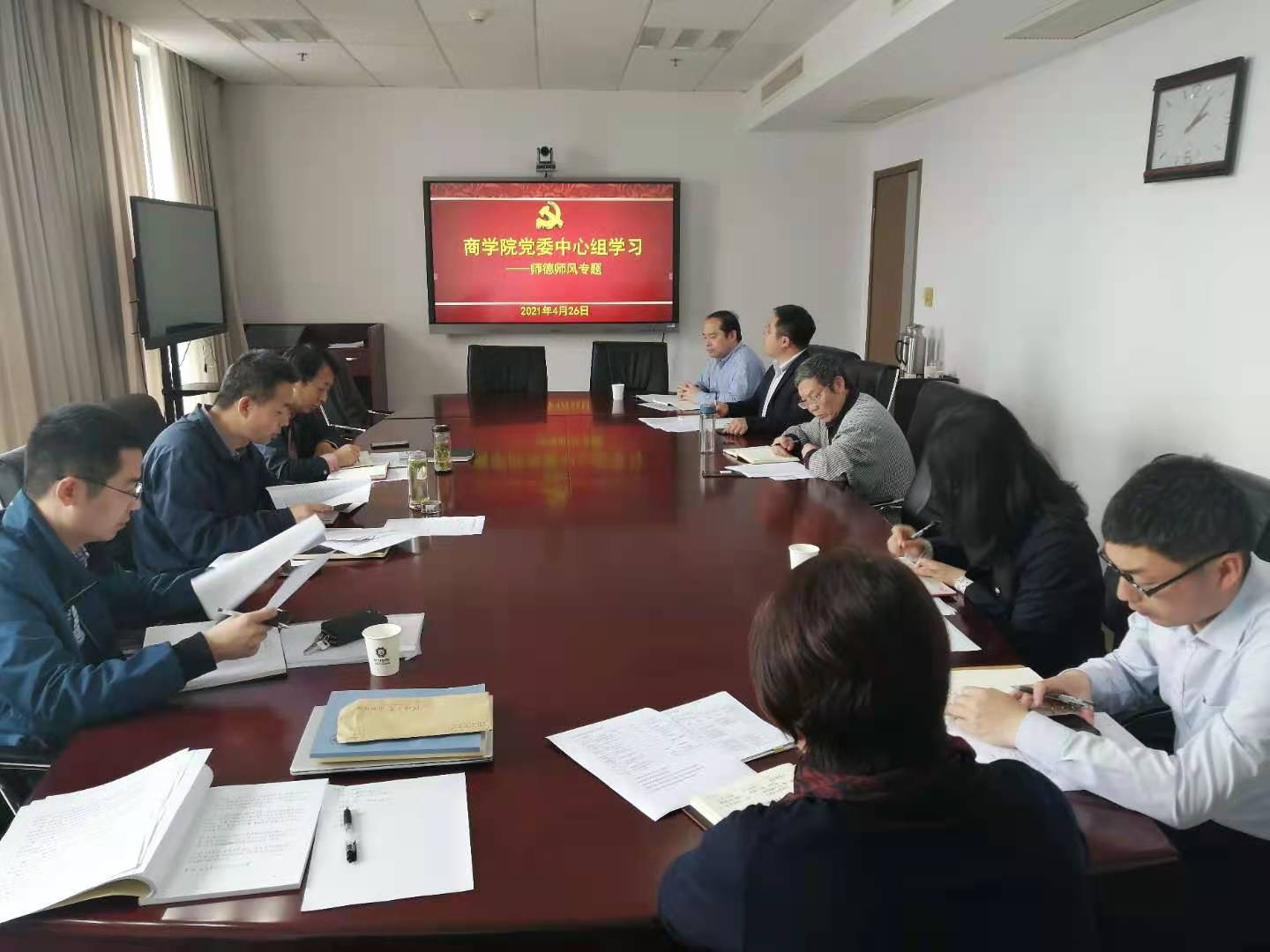 4月26日,黄色影片 党委组织开展师德师风专题学习,党政领导班子全体成员参加学习,党委书记吴宝海同志主持并领学。重点围绕学习习近平总书记在清华大学考察时重要讲话精神、结合学习《黄色影片 加强师德师风建设工作实施办法》《黄色影片 教师师德考核办法(试行)》等进行师德师风专题学习。