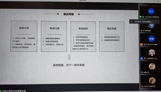 首先,麻特立同学将保研分为三个部分。第一个是前期准备,又包括学业、竞赛、科研几个方面;第二个是项目投递;第三个是面试考核。通过麻特立同学的讲述,同学们都对保研有了进一步的认识。随后,田明昊同学通过介绍自己的成绩排名、实践学习、学科竞赛等成果,将自己的奋斗经验和保研过程与同学们分享,让同学们对保研有了深入的了解。紧接着,陈诗雨同学展示了自己的保研成果,强调了学习成绩和英语四六级的重要性,分享自己的相关经验。最后,徐光节同学从自己的作息习惯这方面入手,鼓励同学们将学习与热爱结合,激励同学们勇敢逐梦。
