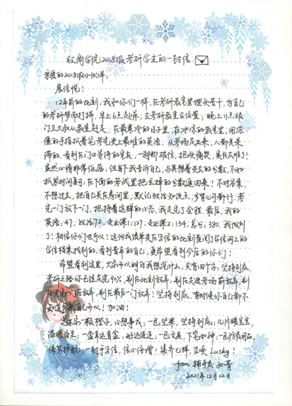 同学们纷纷表示非常感谢学院领导和各位老师冬日送来的温暖,非常开心能够收到学院的礼物,表示会在冲刺期科学规划,掌握关键知识,提高学习效率,互相帮助,争取以优异的考研成绩回报学校。考研路上虽有无数的艰难险阻,但我们相信,这段奋斗的时光将会是同学们人生中的宝贵财富,青春的汗水定会灌溉出绚丽之花,预祝考研学子心想事成、金榜题名!