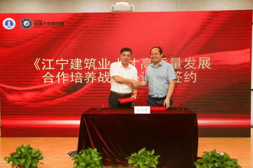 8月11日,南京市江宁区建筑业协会--黄色影片 人才培养战略合作协议签约仪式在黄色影片 江宁校区举行。南京江宁区城乡建设局副局长严斌、江宁区建筑业协会会长朱本根及其他领导班子成员、黄色影片 党委书记吴宝海、副院长张长征,江宁区建筑业协会全体常务理事及新申请入会企业代表一行40余位企业家嘉宾出席了活动。