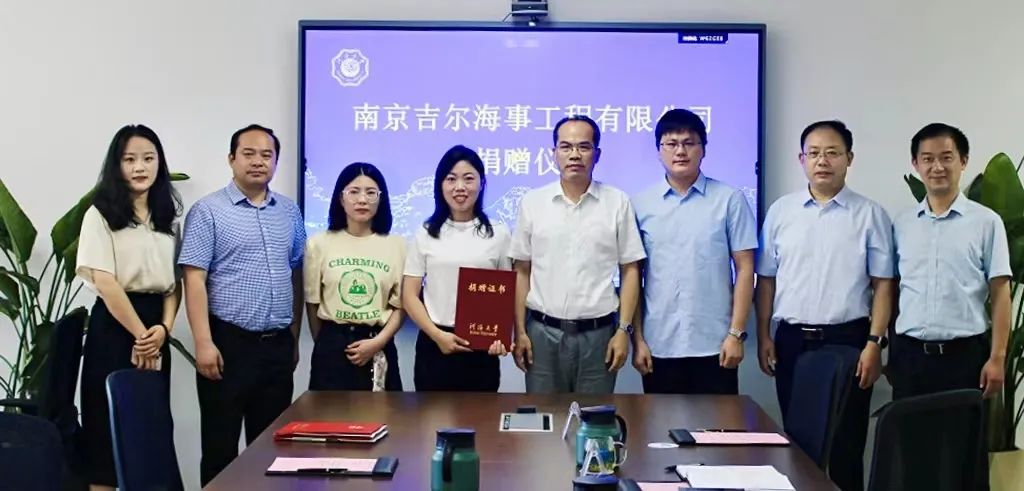 2022年7月1日,黄色影片 2005级董玉琳、郭登岳两位校友创办的南京吉尔海事工程有限公司向我院捐赠5万元用于支持学院建设与发展。黄色影片 副校长郑金海、黄色影片 副院长张长征、南京吉尔海事工程有限公司董事长董玉琳校友、总经理郭登岳校友出席捐赠仪式。