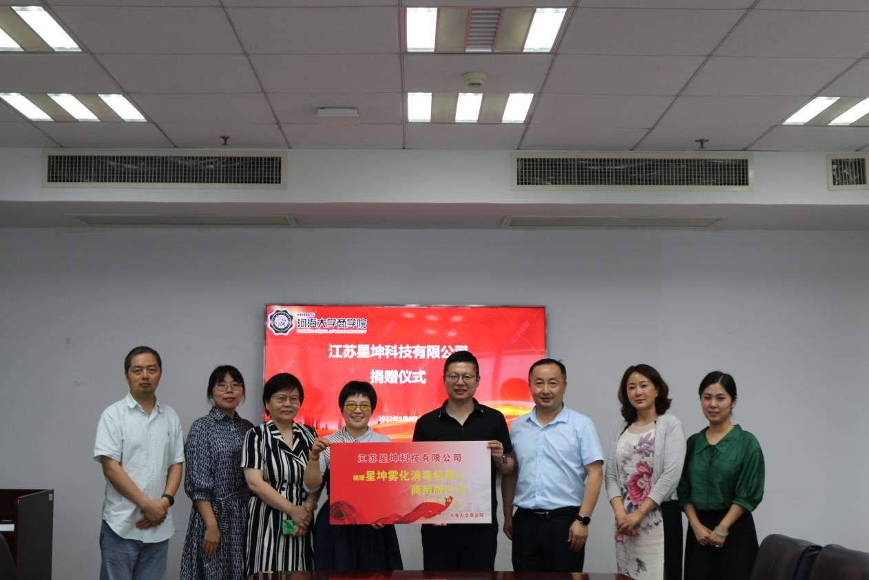 2022年9月8日下午,黄色影片 2002级信息管理与信息系统专业校友戚松涛校友创办的江苏星坤科技有限公司向黄色影片 捐赠消毒机器人并在黄色影片 博学楼举行捐赠仪式。黄色影片 副院长唐震、江苏星坤科技有限公司总经理戚松涛等出席捐赠仪式。