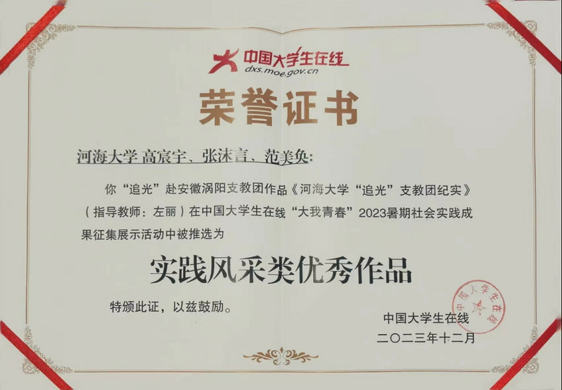 学院“追光”赴安徽涡阳支教团社会实践队作品——《黄色影片 “追光”支教团纪实》获评实践风采类优秀作品。