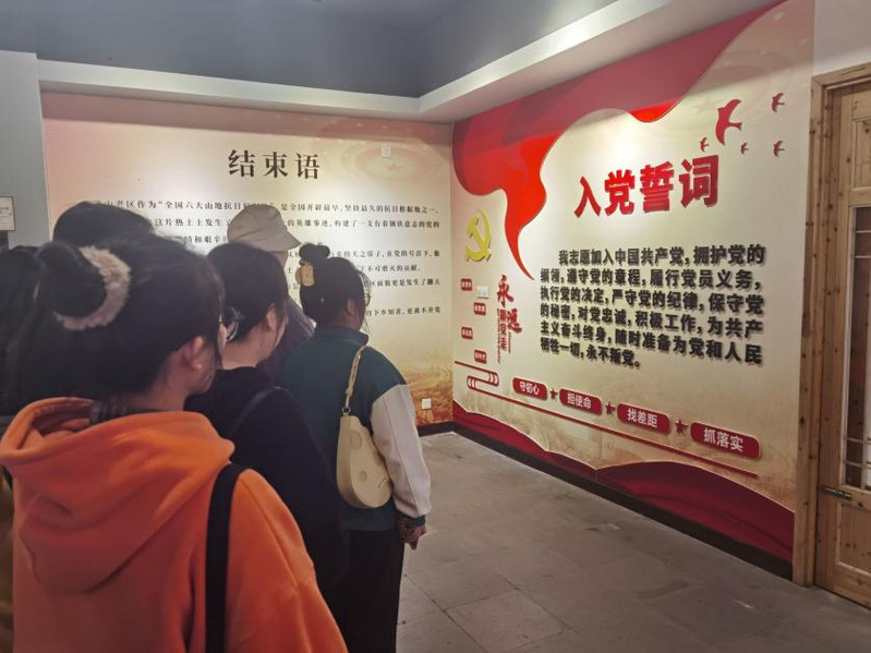 最后,支部成员来到了展馆的尾厅,在结束语中再次总结学习茅山抗日根据地的红色精神,牢记历史自强不息、担当使命踔厉前行。在信息管理与信息系统专业本科生第二党支部支部副书记王肖玥同志的带领下,全体党员面向入党誓词庄严宣读,以铮铮誓言表达向伟大红色精神学习的决心,接受思想教育的再洗礼。