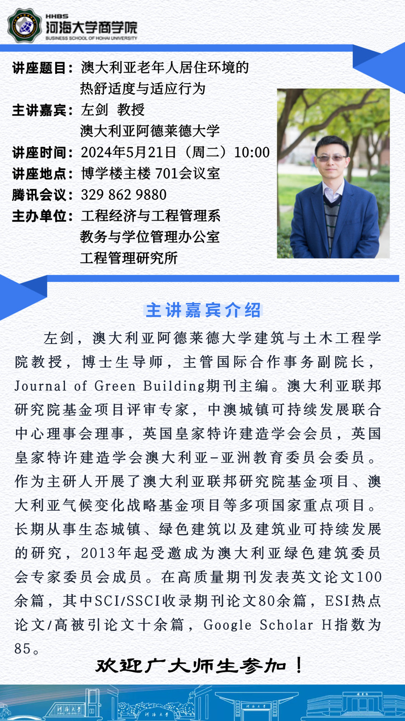 学术讲座通知:澳大利亚老年人居住环境的热舒适度与适应行为