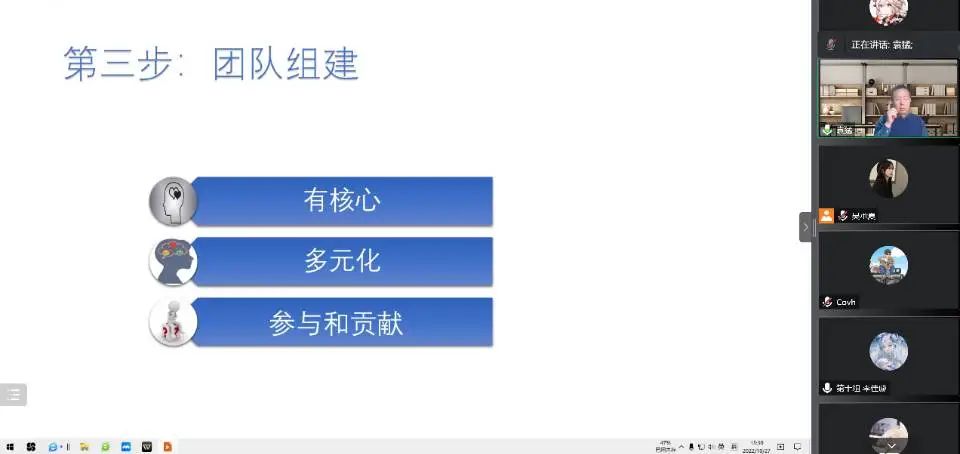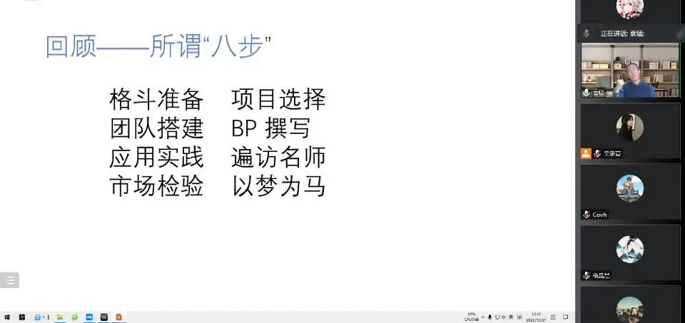 导完项目选择与团队组建之后,袁猛老师简要分析了第四步:BP撰写,点明其痛点为要有清晰的商业模式。在此之后,他重点讲述了第五步——应用实践。袁猛老师点明,问题来自实践,科研开发需要实践,成果应用更需以实践证明。在第六步遍访名师中,袁猛老师阐述了要走访一线行内专家以增加实践经验的想法。而在第七步市场检验中,袁猛老师重申了实践之于项目的重要性。