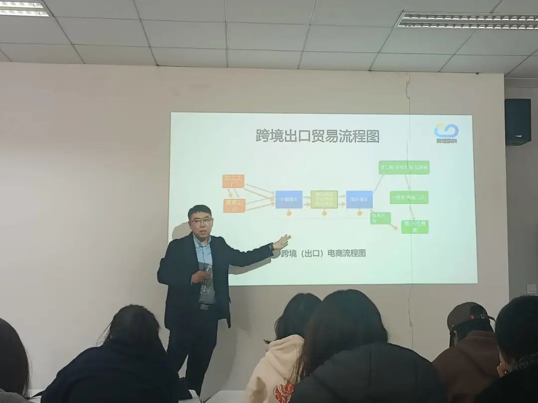 首先,叶庭煜经理阐述了跨境电商和创业行业的发展历程,对跨境电商发展的四个时间节点加以解读,指出电商的核心是流量和转化。同时,叶庭煜经理通过跨境出口贸易流程图,从传统制造业的痛点和机会的角度深入分析,阐述跨境电商的产品应具备的四个特征,讲解了跨境电商的趋势、政策与模式,就跨境电商的优势及意义对同学们进行了深刻指导。