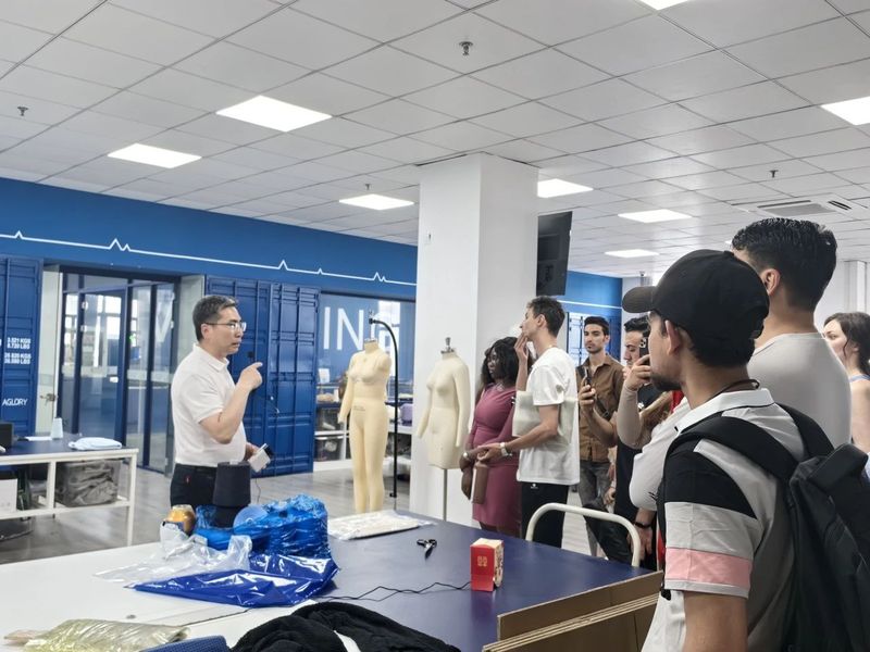 活动伊始,汇鸿中嘉公司副总经理董入明先生带领留学生们参观研发基地并实地体验了公司纺织产品的生产过程。留学生们观摩学习了毛针织产品的整个生产流程,从设计打样到织造生产,再到后期整理,同学们被先进的生产工艺和精细的产品设计深深吸引,纷纷向董入明先生提问,了解每一个环节的细节。通过此次观摩学习,同学们对毛纺织品生产有了更为直观的认识和思考。