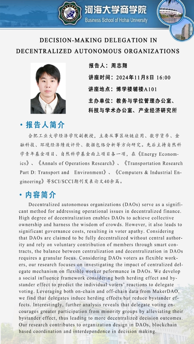 学术讲座通知:Decision-Making Delegation in Decentralized Autonomous Organizations