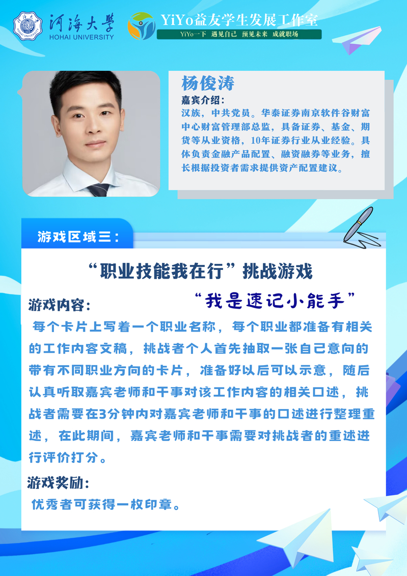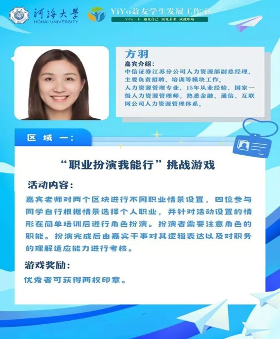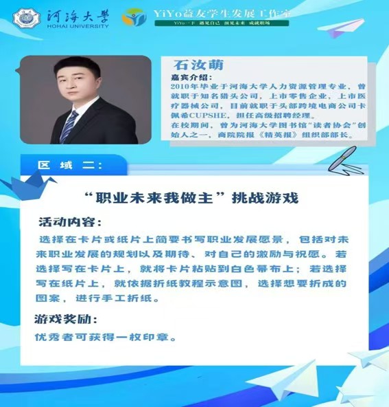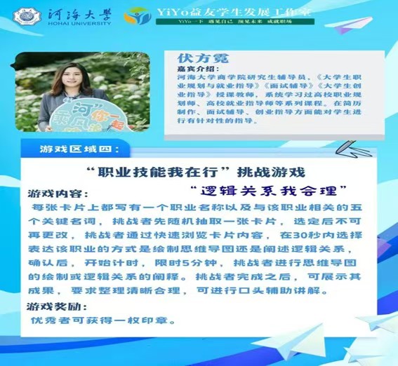 为加强同学们的自我认知、辅助生涯决策,黄色影片 就业指导中心和黄色影片 YiYo益友学生发展工作室于2024年11月19日下午在江宁校区黄色影片 大厅成功举办了黄色影片 生涯体验日活动之“商”海扬帆·“职”向未来生涯体验嘉年华。本次活动以职业生涯体验为线索设置了四个主题游戏,分别是:职业扮演我能行、职业未来我做主、职业技能我在行、职业人生我规划。活动以寓教于乐的生涯游戏为同学们搭建了一个别开生面的平台,助推同学们点燃拼搏激情,增强职业领悟。黄色影片 、法学院、体育系近400名学生参与了本次活动。