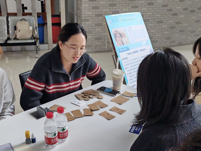 “职业人生我规划”挑战游戏以抽取生涯规划卡片的形式,模拟出完整的职业人生走向,引领同学们体验职业人生的起伏和规划,锻炼应对职场及人生中不同突发情况的能力。嘉宾王洁雨老师对同学们的表现进行了点评指导,并分享了自身的教育经历以及求职经验。在虚拟的职业人生体验中,同学们对于未来职业人生的规划更加明晰,逐步掌握灵活应对生涯挑战的能力。