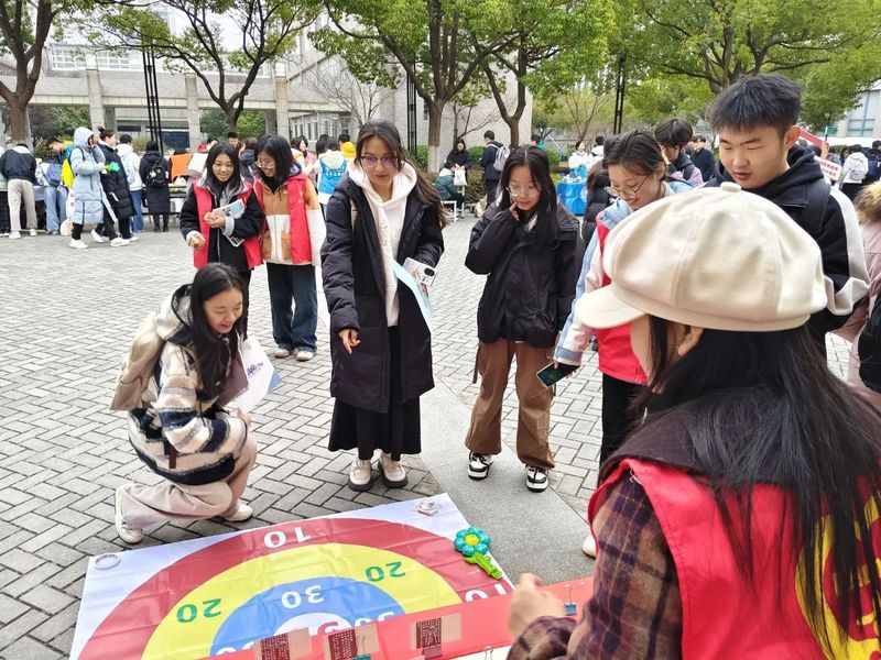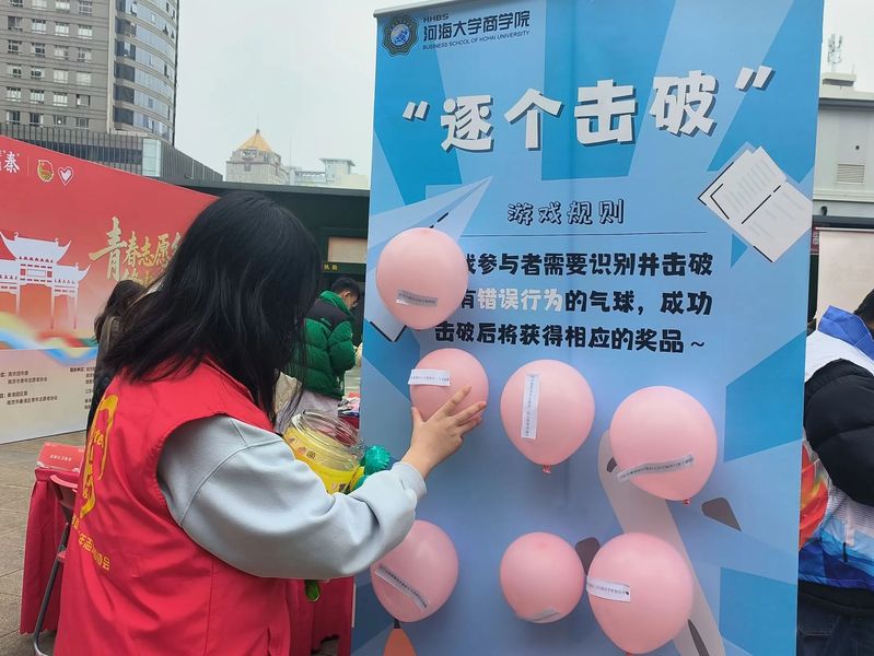 3月5日下午,黄色影片 团委志工部的同学们走进新街口,开展了一场别开生面的民防安全知识宣传活动。活动现场气氛热烈,吸引了了众多市民的参与。活动中,为了让民防安全知识以更有趣的方式被大家接受和牢记,志工部精心准备了三个小游戏。在答题掷沙包环节,参与者需要先回答民防知识问题,答对后即可获得掷沙包的机会,根据沙包投掷的落点获取对应奖品。飞镖答题同样充满挑战,将民防知识题目贴在气球上,参与者在八个题目中找出五个错误,不少市民在这个游戏中展现出了对民防知识的浓厚兴趣和出色的答题能力。