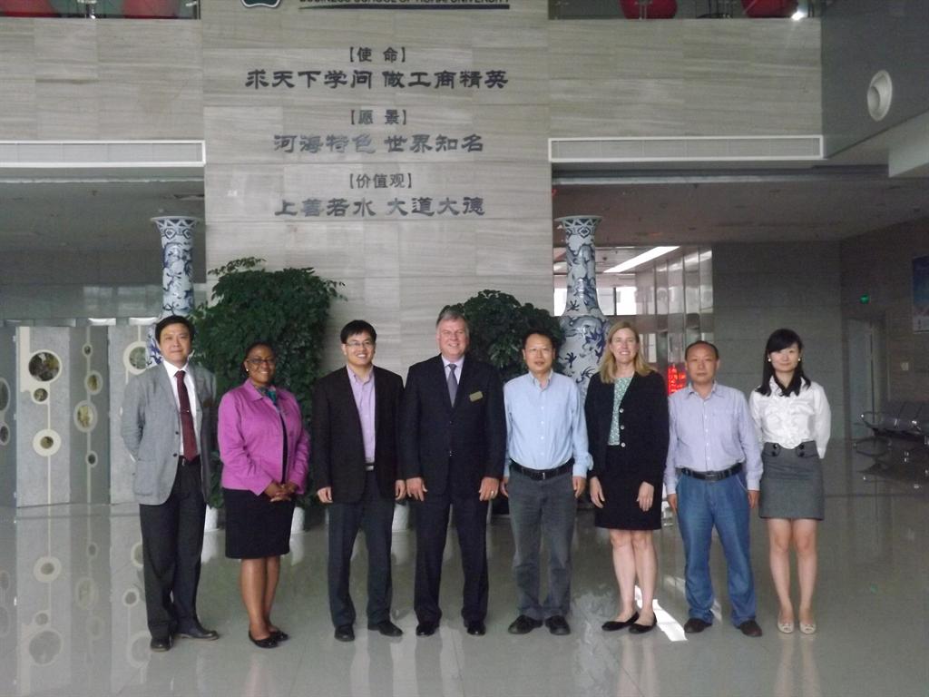 Five delegates from University of Missouri-Kansas City, including Prof. Kevin Truman, director of International Division, Dr. Kami Thomas, associate dean of Henry W. Bloch School of Management, Ms. Kimberly Young, executive director of Executive Education, Mr. Wilson Ang, director of China and Asian programs in Henry W. Bloch School of Management, and Mr. Jun Zhao, associate director of China and Asian programs in Henry W. Bloch School of Management visited Business School of Hohai University on May 31th. Prof. Zhang Jisheng, associate director of International Cooperation Division and Prof. Huang Dechun, assistant Dean of Business School of Hohai University, met them in meeting room 301.